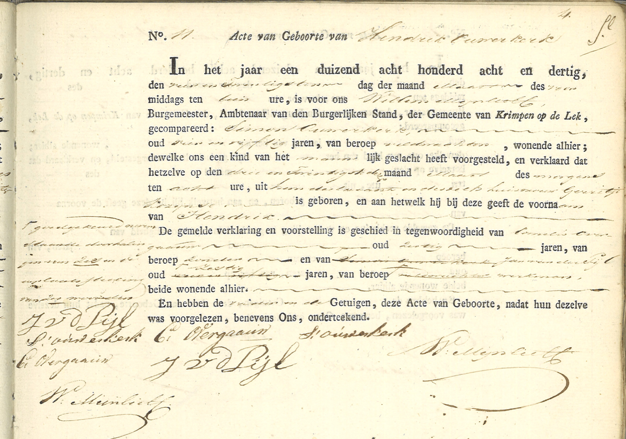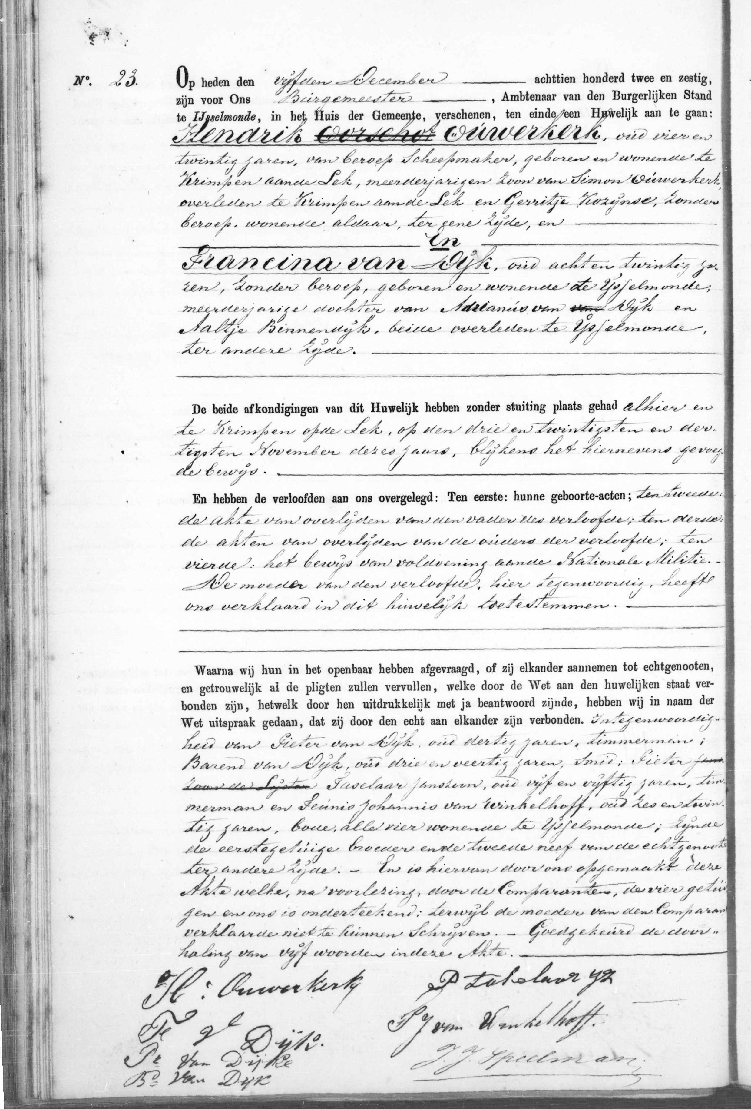 Their fourth son Hendrik Ouwerkerk was born there in 1838. Hendrik, who was a ship builder, married Francina van Dijk in 1862. Their only child Simon Ouwerkerk was born in 1863.