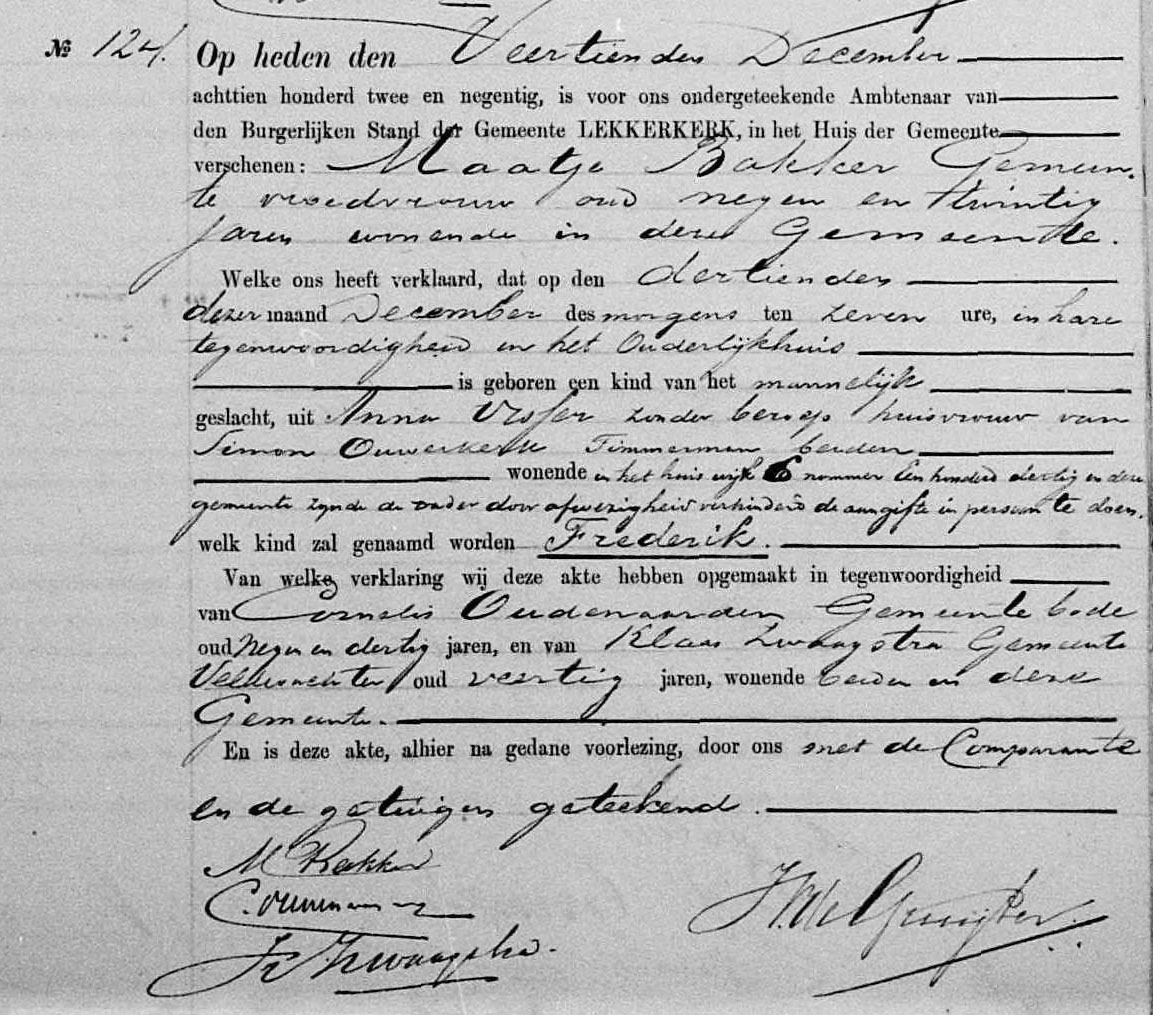 Simon, who was a warehouse manager, married Anna Visser in 1888. In total they got 13 children, of which third son Frederik was born in 1892 in Lekkerkerk.